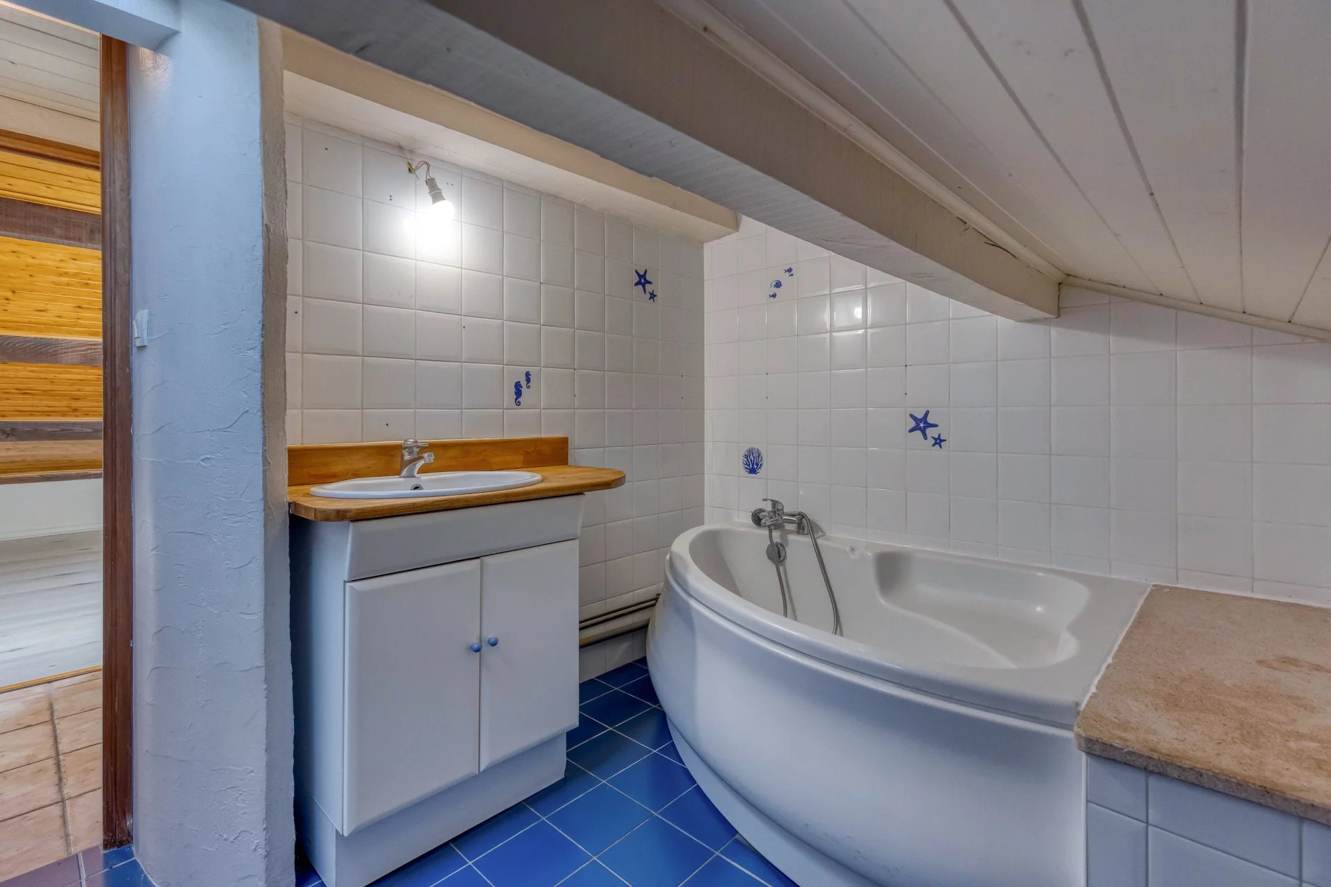 A l'étage : 3 chambres mansardées, salle de bain Wc.